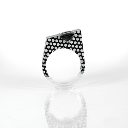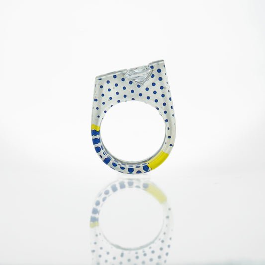 for her bold acrylic pieces that pop with vibrant art prints. After earning a BFA in Metals and Jewelry from SCAD, she pivoted from silver and gold to acrylic due to limited resources. Inspired by art books and fashion magazines, she developed a unique layered acrylic technique, combining the pages into wearable art. Transforming simple materials into striking, wearable art, her bold designs are guided by the philosophy: “If you can’t see it from ten feet away, why bother?”