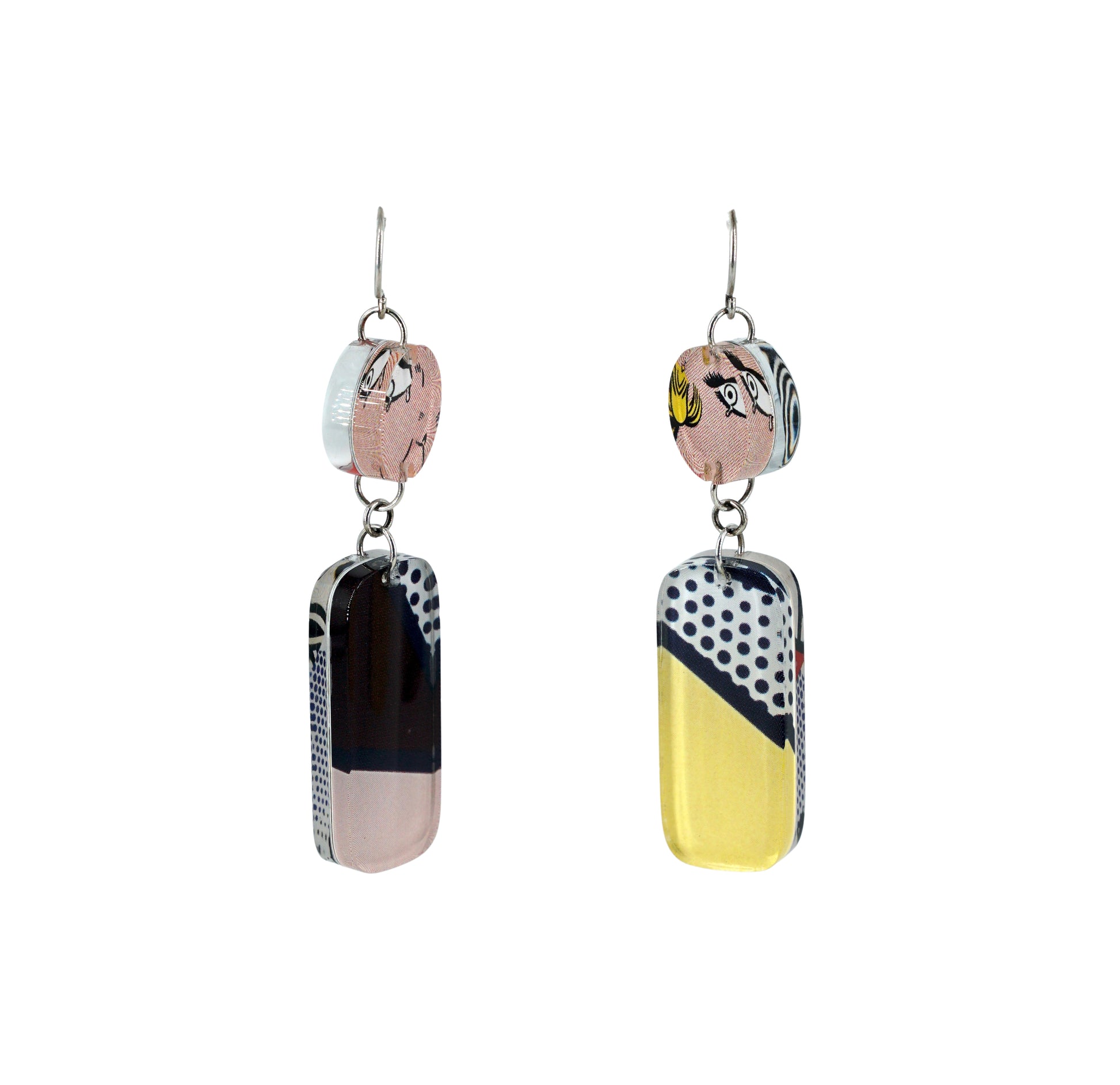 Unleash your inner art lover with these eye-catching two-tier drop earrings! These statement pieces are crafted from lightweight acrylic with a playful, reversible design featuring vibrant Pop Art-inspired graphics on both sides. The top round segment showcases an expressive face motif, while the elongated rectangular drop combines bold patterns and contrasting colors for an artistic, modern flair. With their lightweight build, these earrings are perfect for adding a splash of color and fun to any outfit. Ideal for art enthusiasts and fashion-forward individuals looking to stand out.