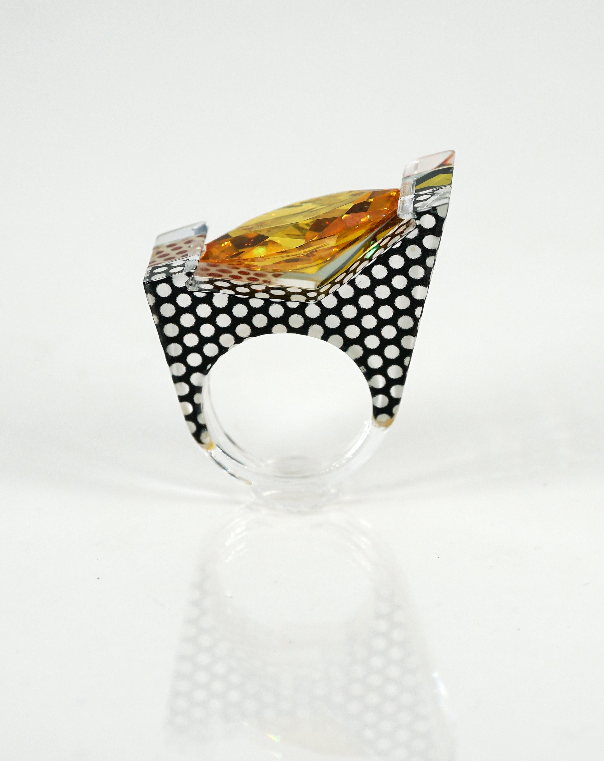 Pop Art gem ring features multi-color prints on one side, black and white ben-day dots on the other. This striking acrylic ring appears transparent from one angle and showcases pop art prints from another. A large citrine marquise cut gem is channel set into the top of this asymmetric angular design.