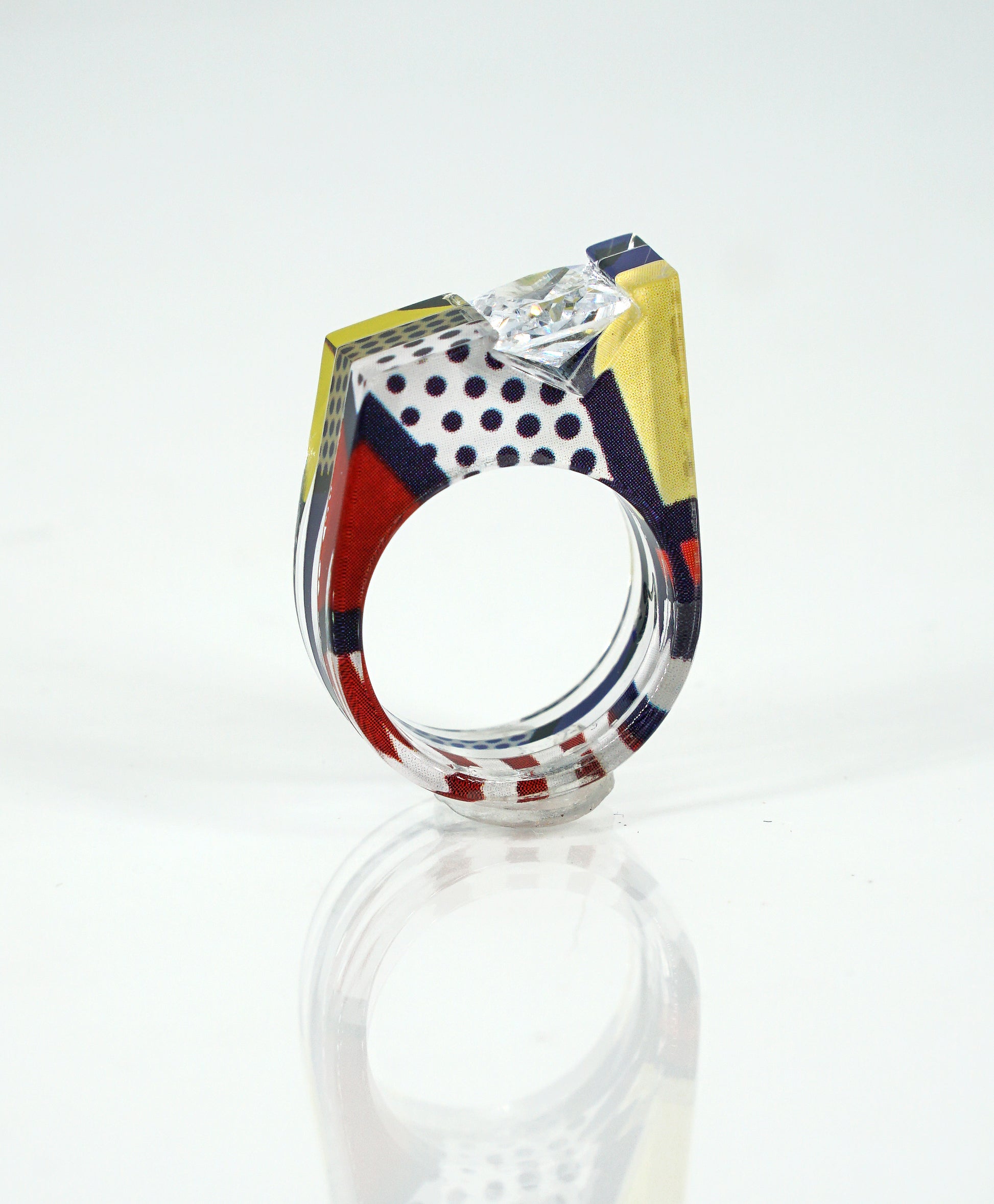 Pop Art Gem Ring featuring bold yellow and blue with black and white prints on one side, multi-color print with dots on the other. This striking acrylic ring appears transparent from one angle and showcases pop art prints from another. A princess cut cubic zirconia gem is channel set at the top of this asymmetric angular design.