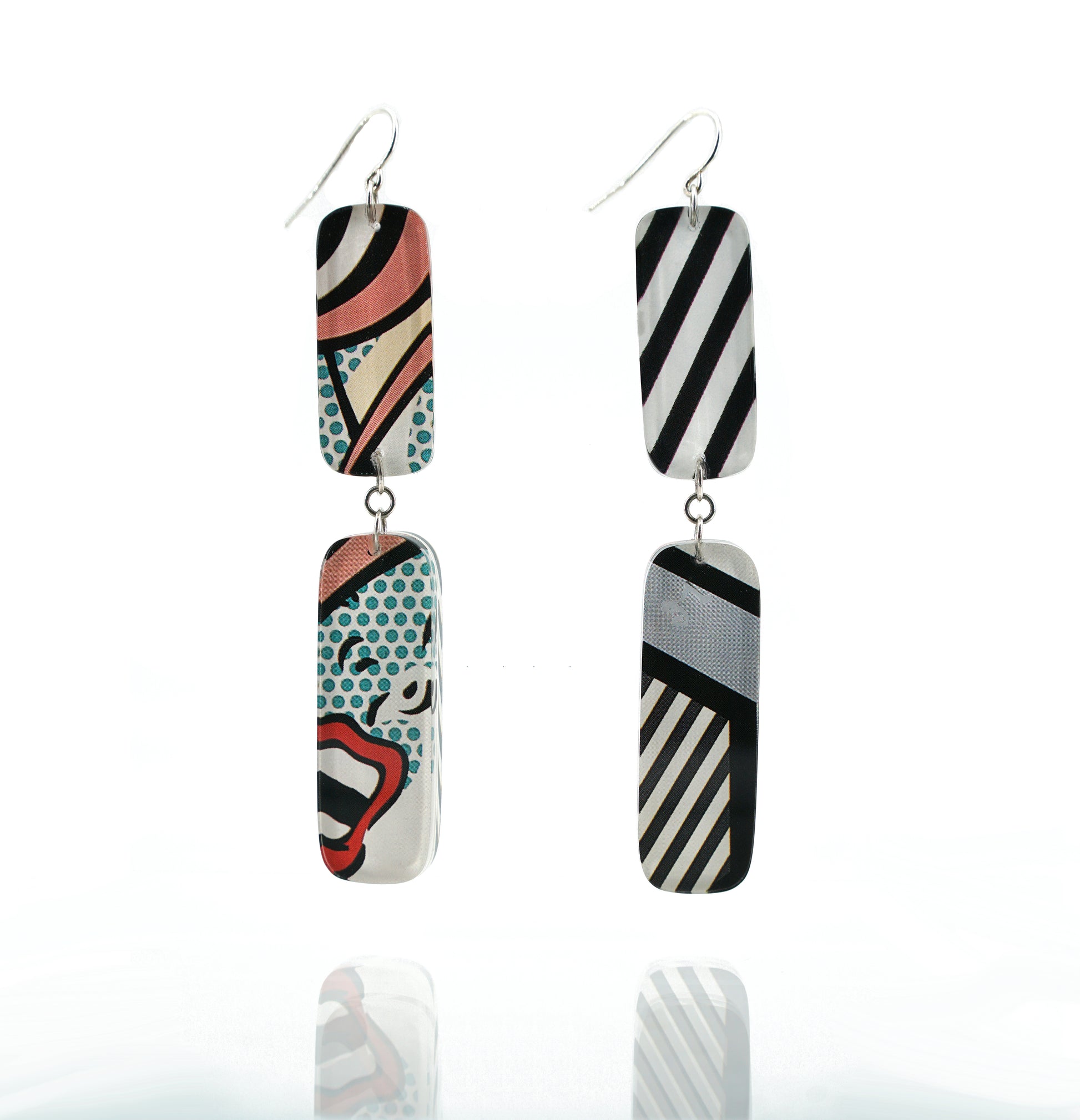 These playful drop earrings showcase bold pop art-inspired prints with colorful comic motifs. Each earring features two rectangular panels, creating a striking geometric silhouette. The front displays vivid faces and graphic elements, while the back offers contrasting monochromatic patterns for a versatile, eye-catching look. The reversible design can be worn two ways, perfect for adding a splash of artful fun to any outfit.