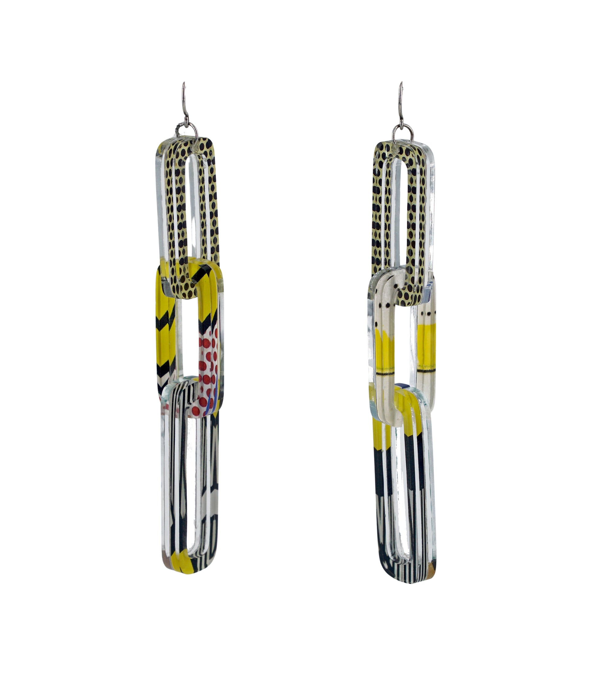 These striking Pop Art chain link earrings showcase a playful and dynamic design with interconnected rectangular loops. Each link is adorned with bold patterns and vivid colors inspired by classic pop art, creating a lively, statement piece. The overlapping links allow the earrings to sway with movement, adding an eye-catching touch to any outfit. Perfect for art lovers and those seeking to add a burst of color and personality to their look.