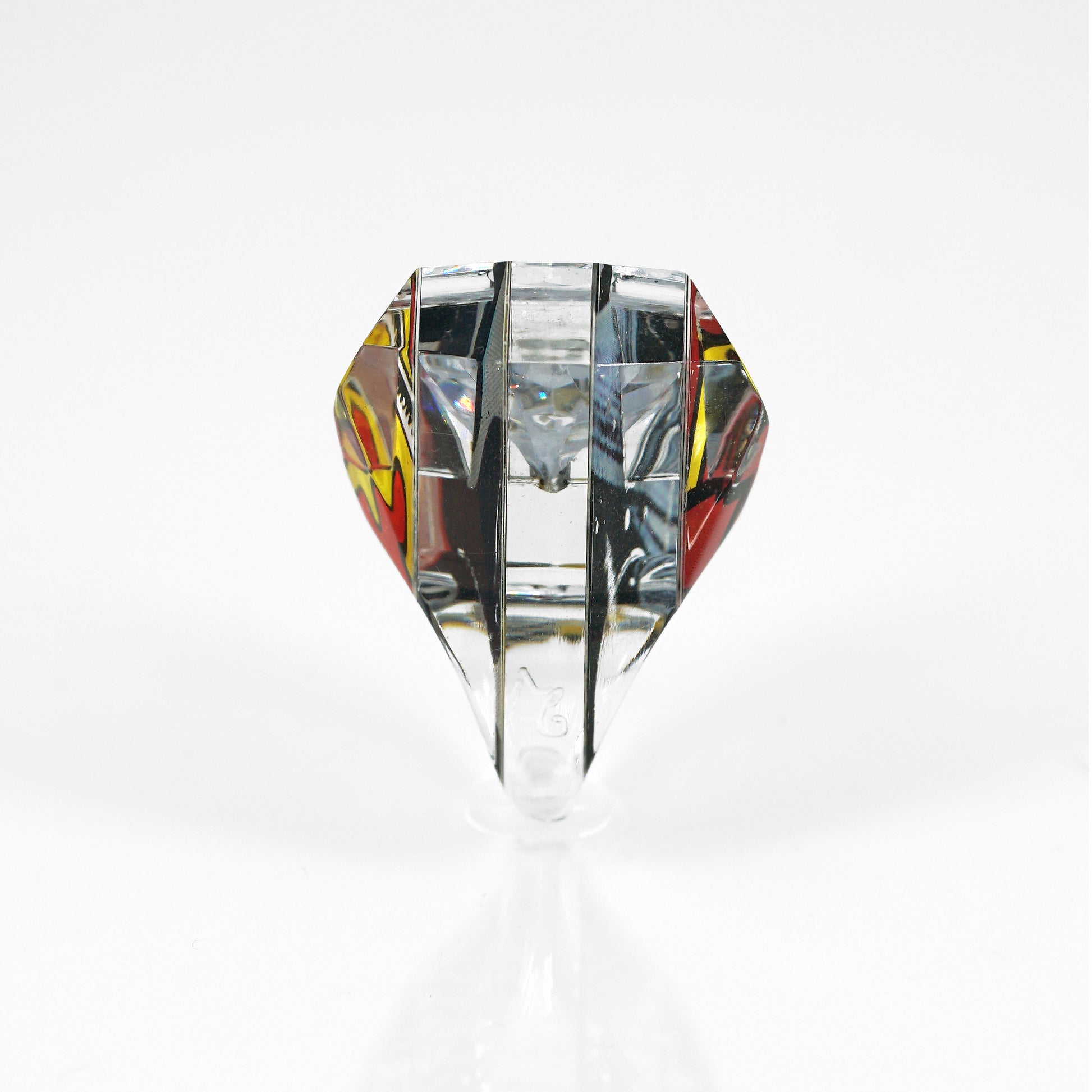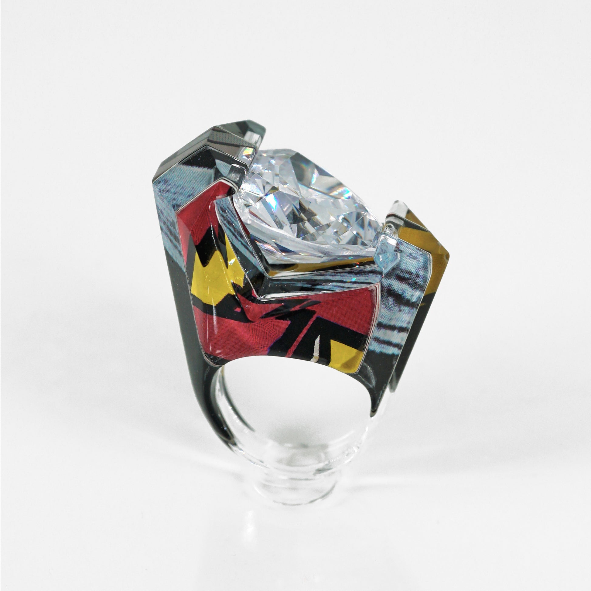 Pop Art gem ring features layers of multi-color prints and black and white ben-day dots. This striking acrylic ring appears transparent from one angle and showcases pop art prints from another. A large trillion cut gem is channel set into the top of this asymmetric angular design.