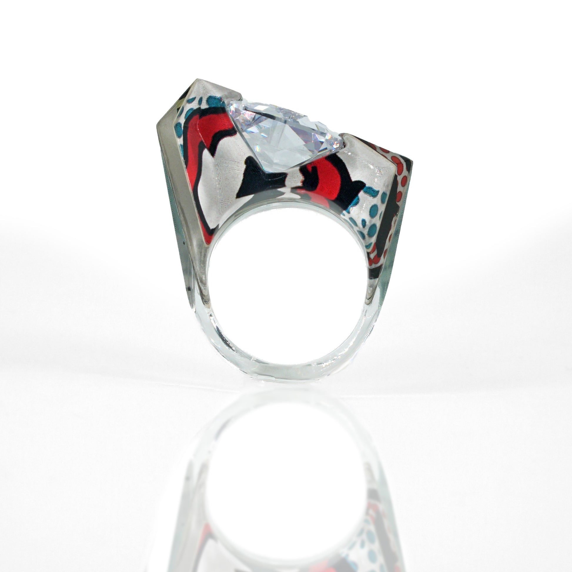 Pop Art gem ring features layers of multi-color prints and black and white ben-day dots and stripes. This striking acrylic ring appears transparent from one angle and showcases pop art prints from another. A large emerald cut gem is channel set into the top of this asymmetric angular design.