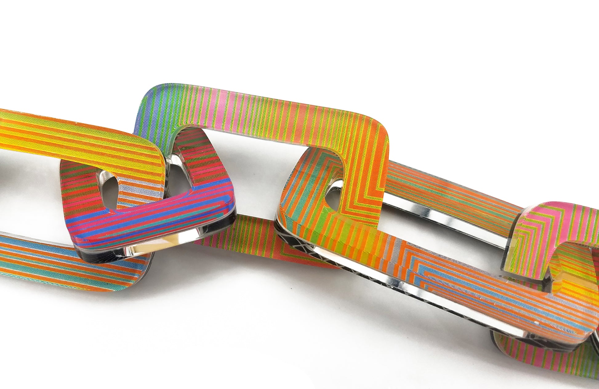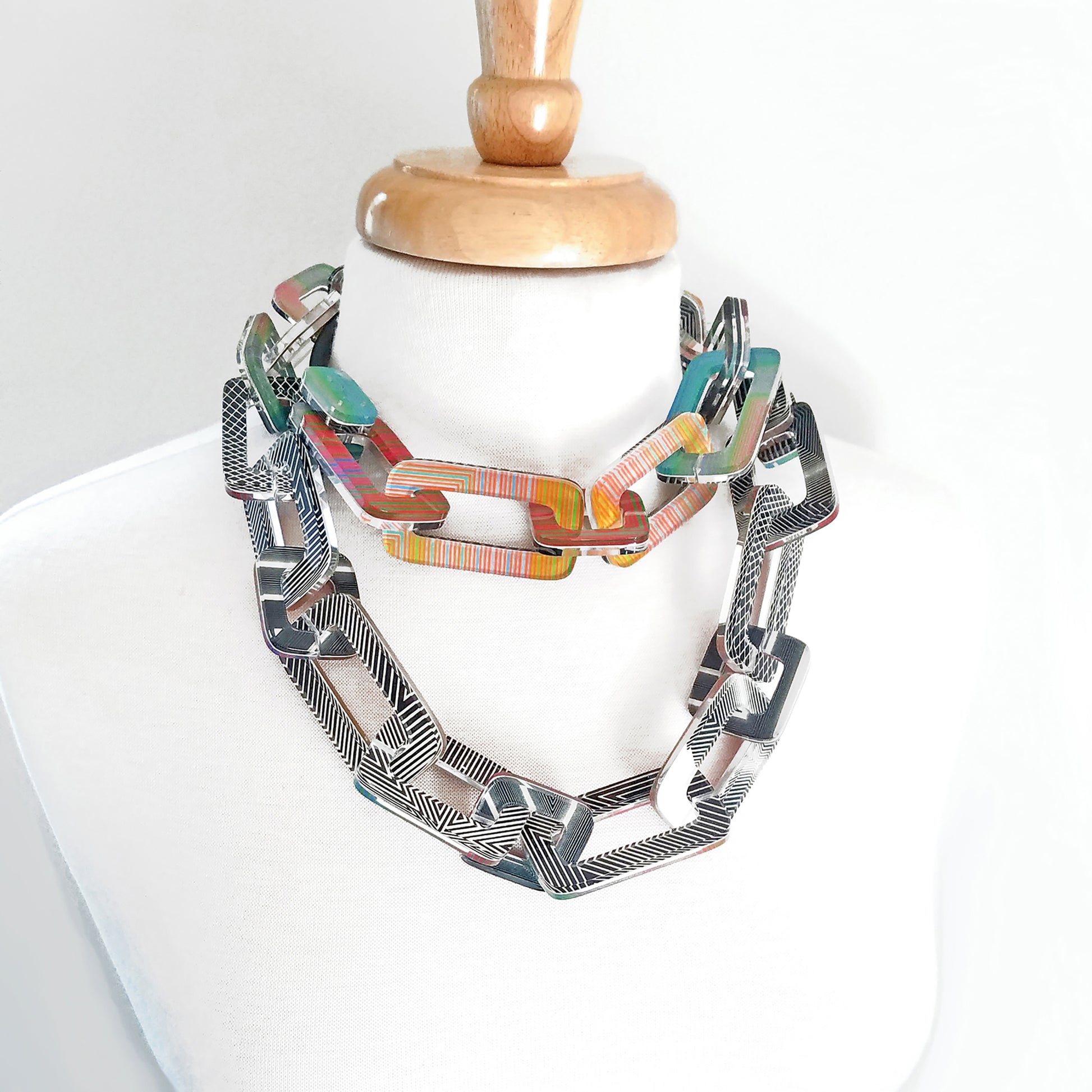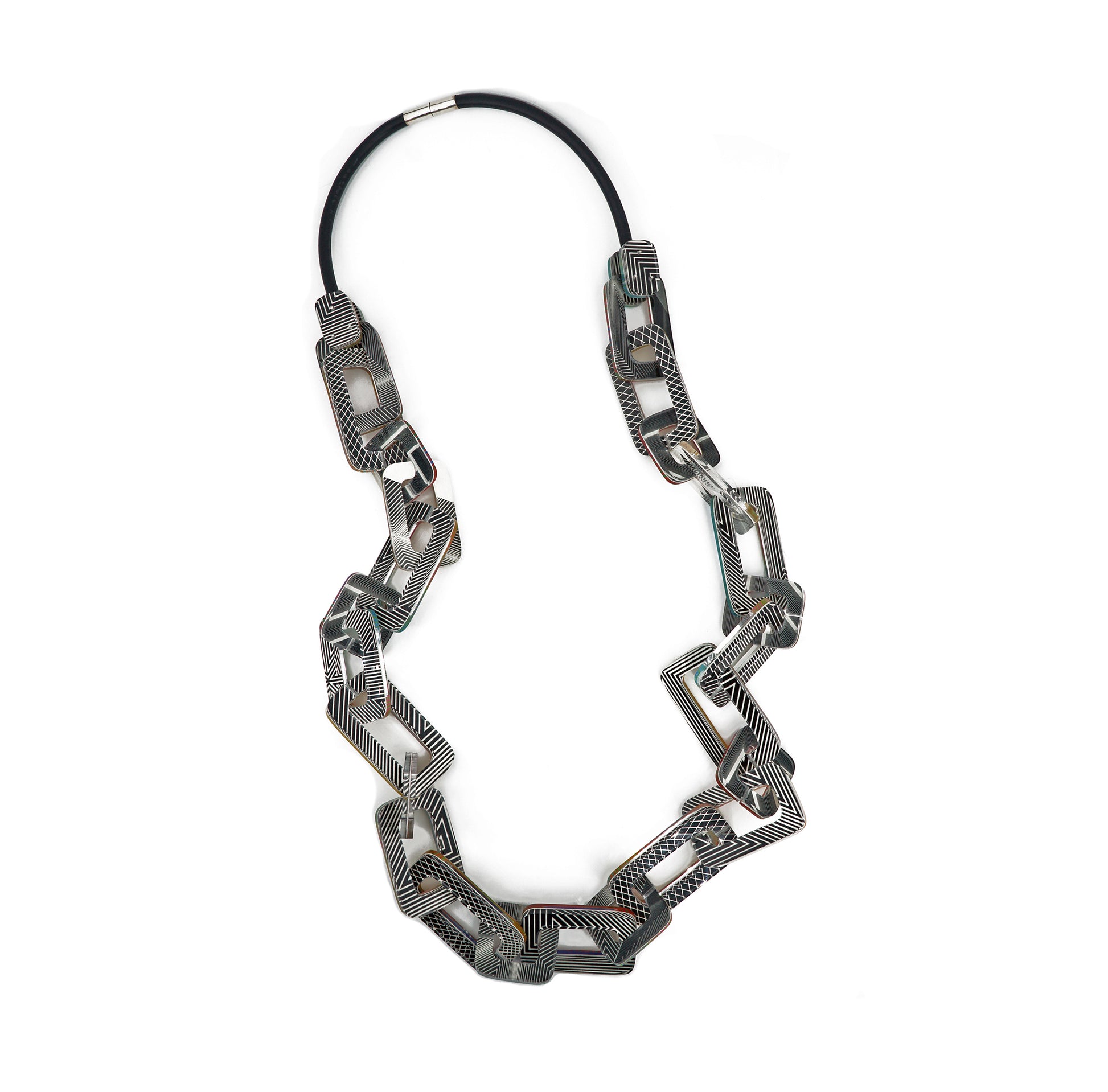 This long, reversible chain showcasing bold op art prints is a versatile statement piece designed to elevate any look. One side features bold black and white geometric patterns for a striking, modern vibe, while the reverse side offers a vibrant array of multicolored stripes for a playful touch. Each link is crafted from layered acrylic, creating depth and visual intrigue while remaining lightweight and comfortable to wear. With a sleek magnetic clasp, the length of the chain is adjustable to allow for different styling options—wear it long, doubled, or layered for added impact. Perfect for art lovers and those who appreciate unique, wearable art pieces.